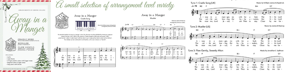 The Mueller piano collection is an 8 page PDF which contains 6 different arrangements: